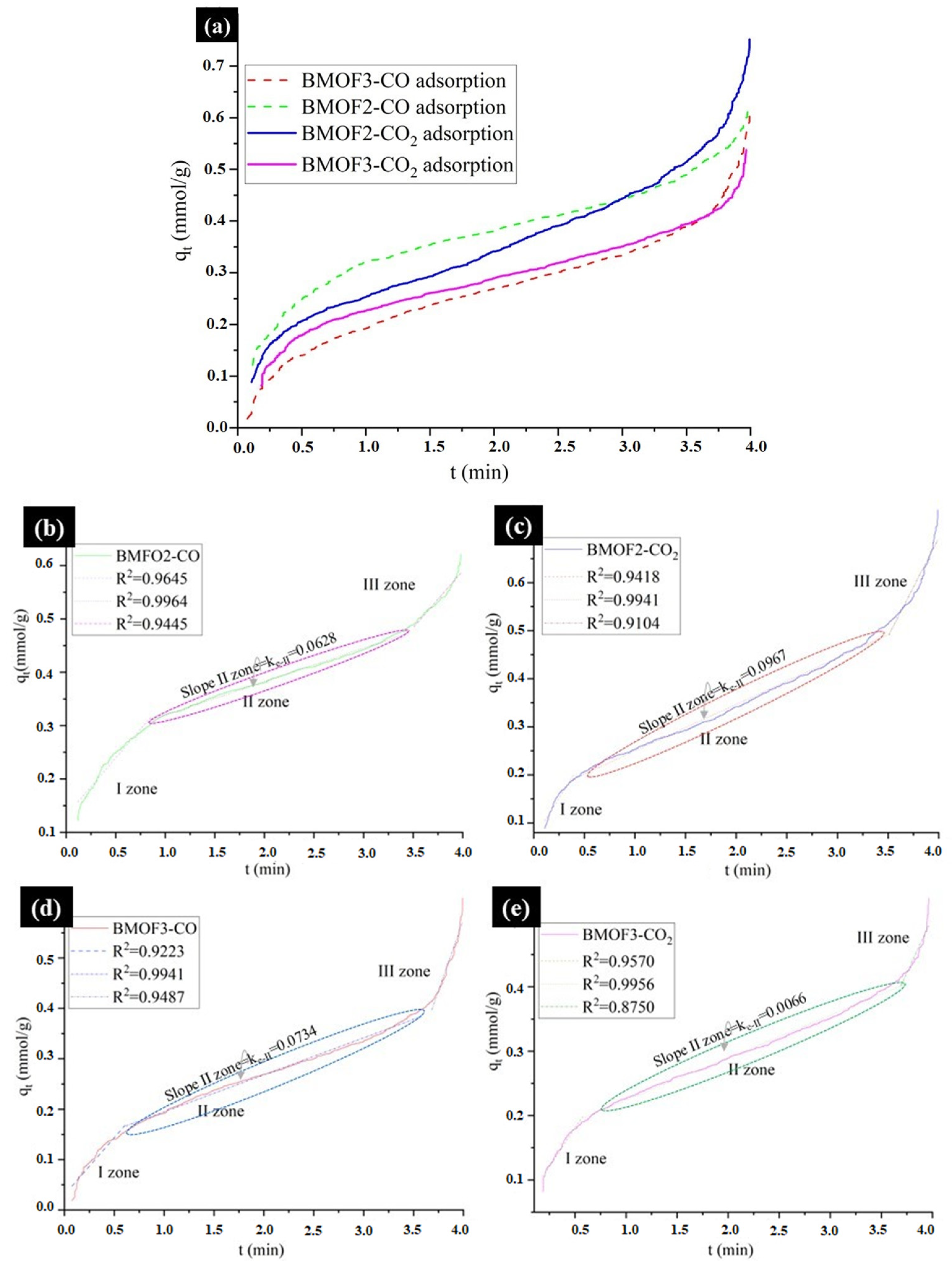 Figure 9. The adsorption capacity of both composites studied, (a) CO2 and CO adsorption, and (be) gas kinetics adsorption linearized.