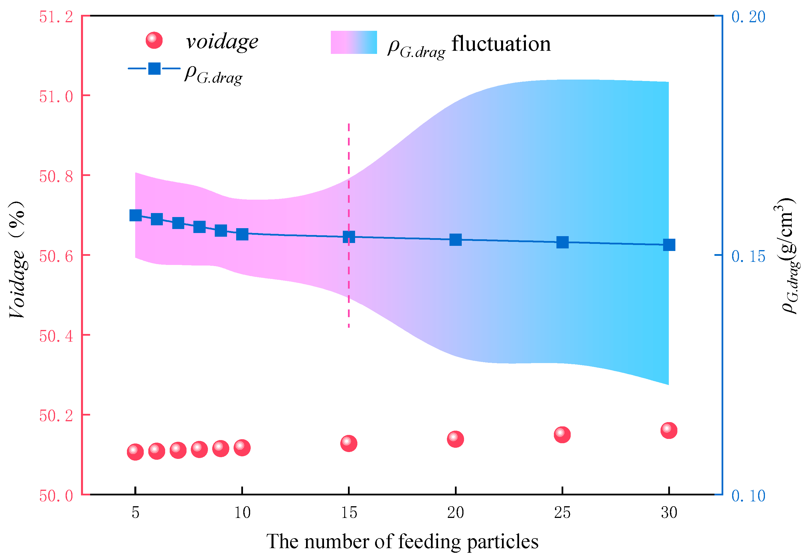 4.1. Variation Law of Voidage and ρG.drag with the Number of Feeding Particles