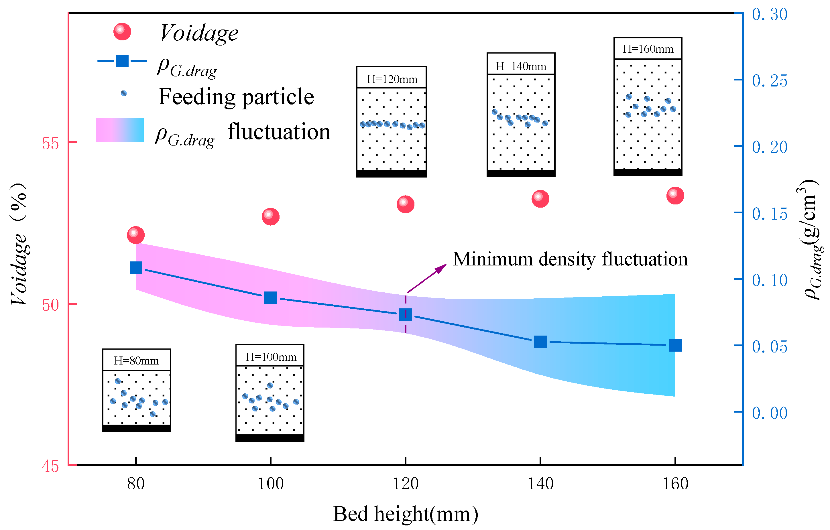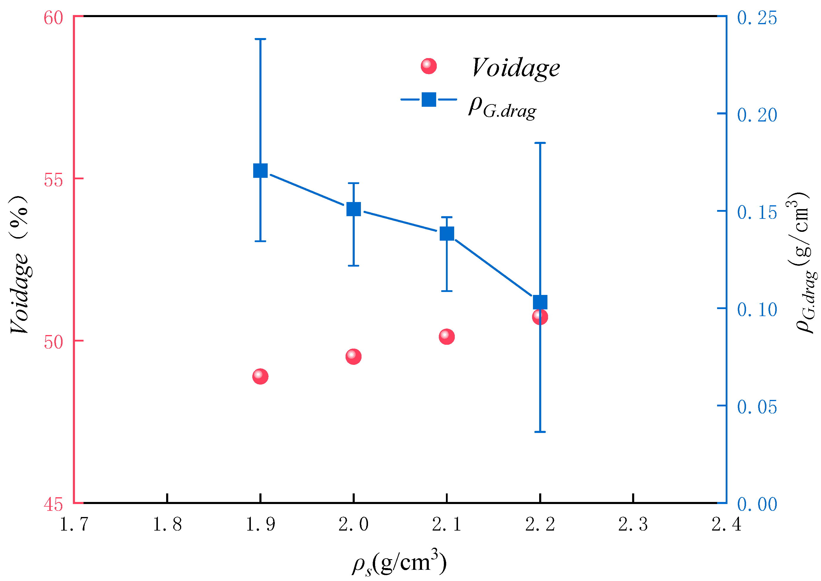 4.2. Variation Law of Voidage and ρG.drag with the Density of Feeding Particles