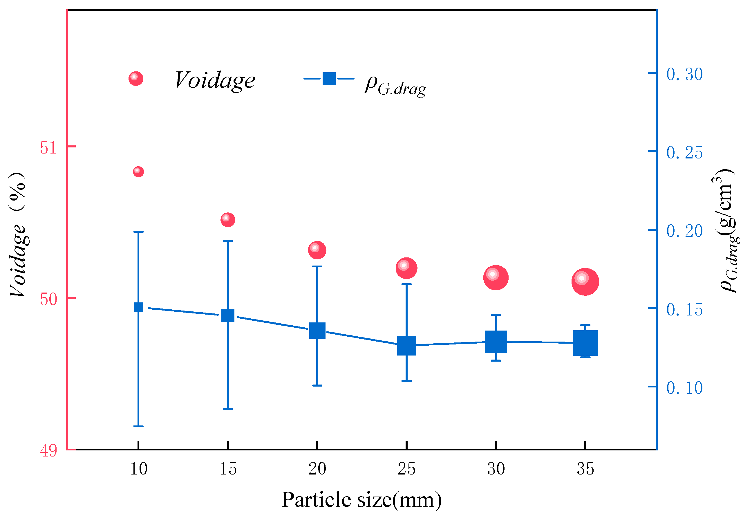 4.3. Variation Law of Voidage and ρG.drag with the Size of Feeding Particles