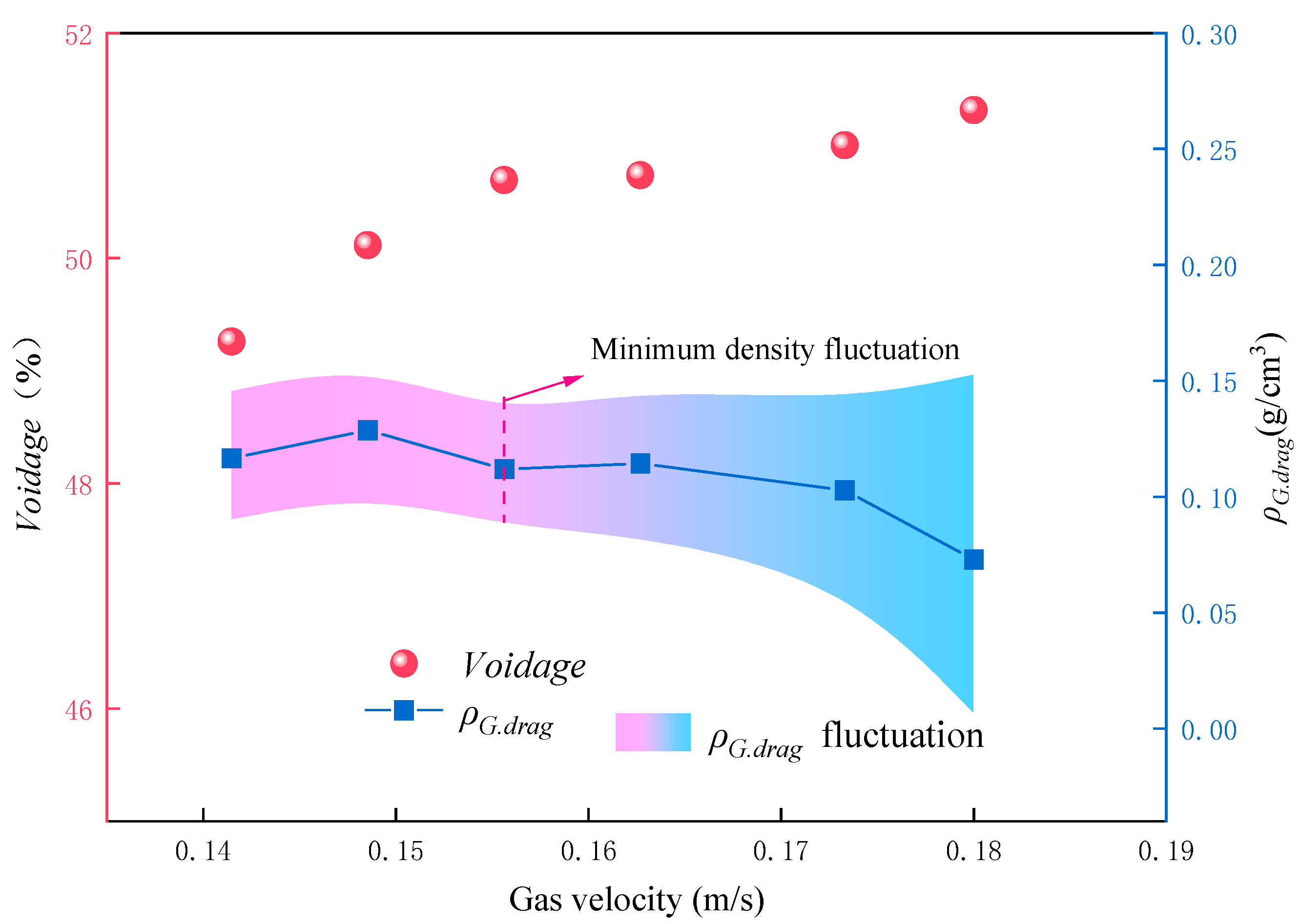 4.4. Variation Law of Voidage and ρG.drag with the Gas Velocity