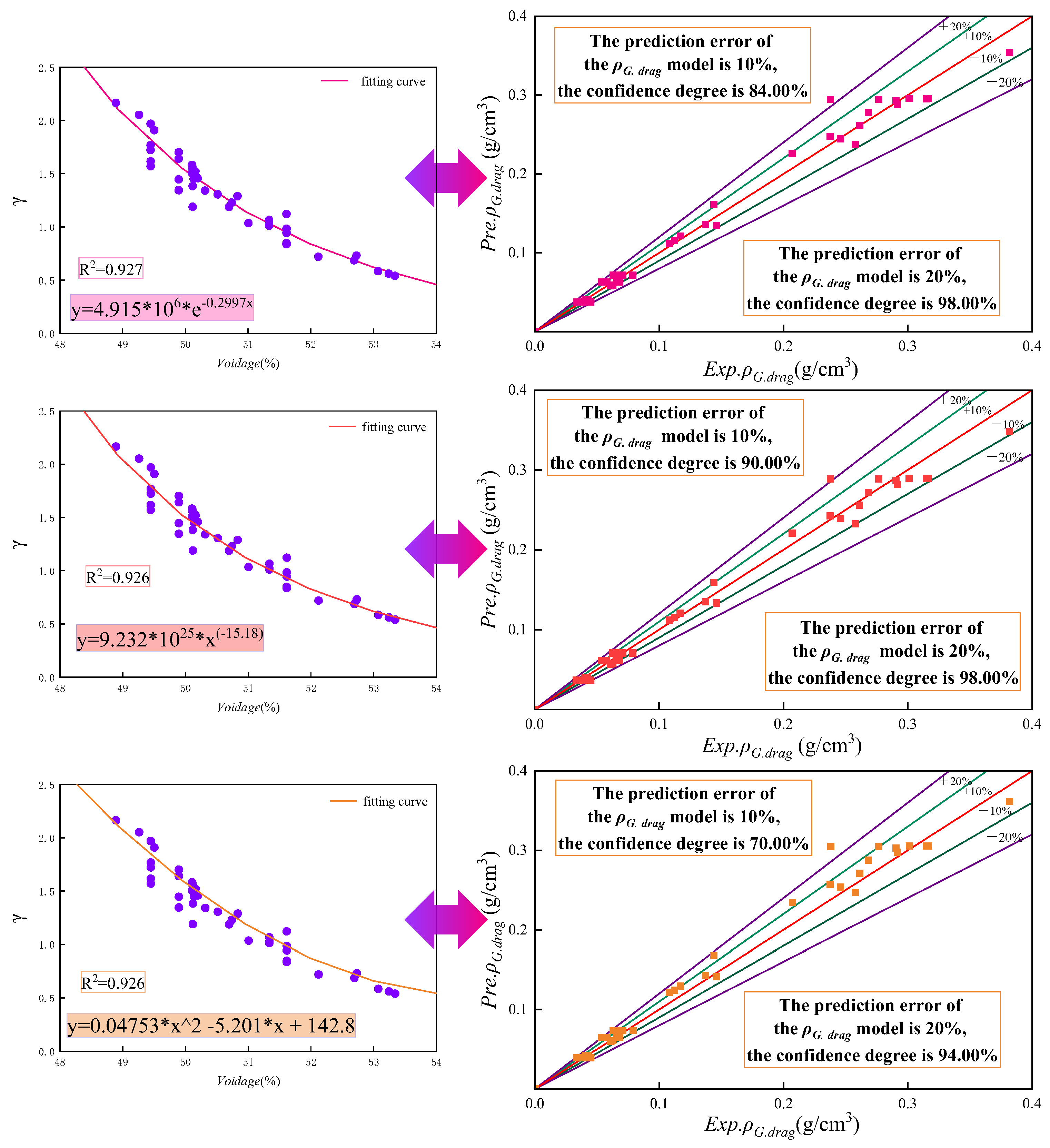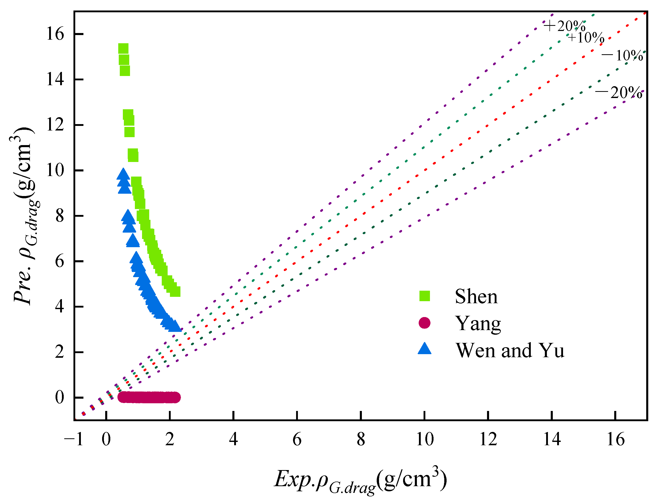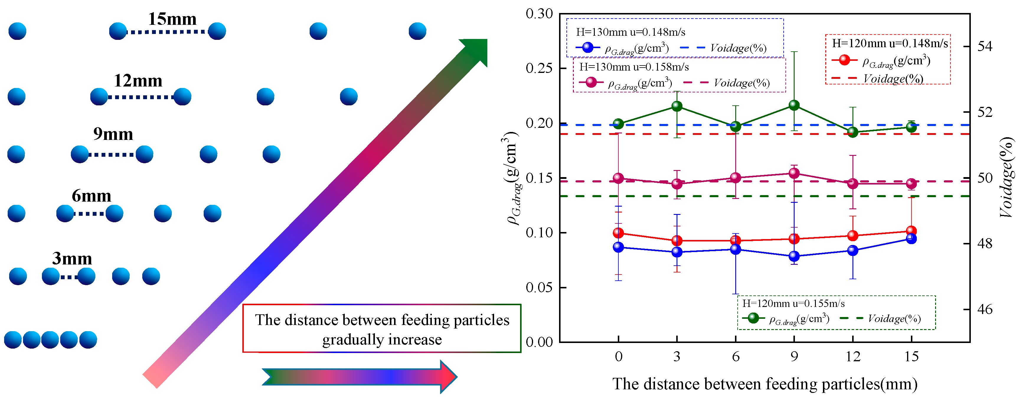 - The focus is on exploring the variation laws of the ρG.drag and voidage under a different bed height, gas velocity, number, particle density, size, and interparticle distance of the feeding particle group, and establishing the prediction model for the ρG.drag of the feeding particle group with the voidage as a correction factor;