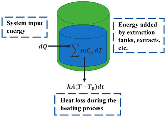 where , is the mass of the extraction tank, is the specific heat capacity of the extraction tank, is the mass of the decoction pieces, is the specific heat capacity of the decoction pieces, is the mass of the extraction solvent, is the specific heat capacity of the extraction solvent, is the heat dissipation area of the liquid phase bulk, is the heat exchange coefficient between the solution and the external environment, is the solution temperature, and denotes the measured soaking temperature of the medicinal materials at . Although in practice, there may be fluctuations of a few degrees Celsius during long industrial batches, its impact is negligible and can therefore be considered constant. In the calculation, the extraction apparatus is considered cylindrical. Since heating is mostly from the sides and bottom, the heat exchange area between the jacket and the container can be regarded as the side and bottom areas of the cylinder, and the heat dissipation area can be regarded as the top area of the cylinder.