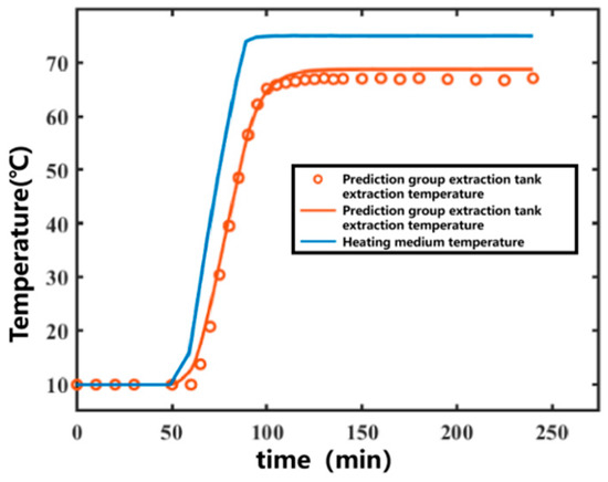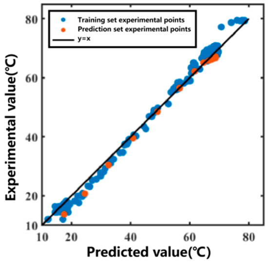 The 11th set was used as the prediction set for forecasting. After obtaining the temperature variation in the heating medium, the temperature variation curve inside the extraction tank over time was predicted, as shown in Figure 5. The prediction R2 for the prediction set was 0.9950. The data fitting part served as the training set, and the prediction group served as the prediction set. The correlation plot between the actual values and predicted values of the model is shown in Figure 6. Most of the predicted temperature values versus the measured values lie on the line. This indicates that the model developed in this study can satisfactorily predict the extraction temperature changes.