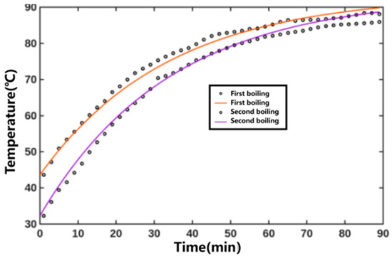 The fitted temperature parameters were substituted into the results to obtain the temperature versus time curve, as shown in Figure 7. The heating medium temperature was constant, and the internal temperature of the extraction tank gradually increased. The coefficient of determination R2 for fitting the internal temperature variation curves of the extraction tank during the first and second decoctions of Xiaochaihu Decoction were 0.9904 and 0.9915, respectively. The relevant parameters obtained from three global fittings for the Xiaochaihu Decoction extraction process are detailed in Table 3. Overall, the fitting effect was satisfactory.