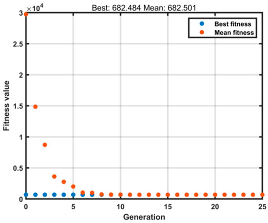 The optimized parameters varied slightly across different groups. In the extraction processes of ginkgo leaves and Xiaochaihu Decoction, only two parameters required fitting. The genetic algorithm (GA) optimization utilized relevant MATLAB functions with the following settings: population size of 500, maximum generations of 25 (as shown in Figure 8), and a mutation probability of 0.05. All other parameters remained consistent with the default MATLAB settings. Each optimization approach was executed three times in parallel, and both the heat dissipation coefficient and heat transfer coefficient demonstrated good consistency across runs.