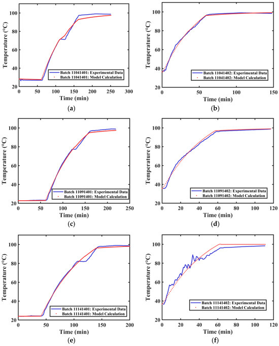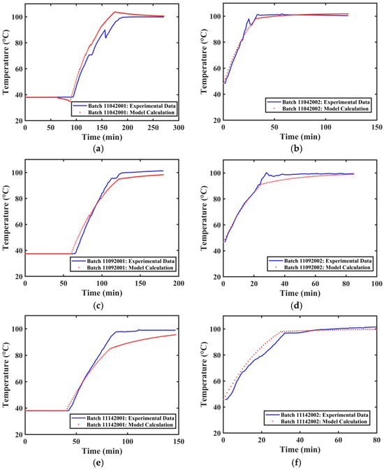 The temperature data and steam pressure data from three batches of Xiaochaihu Capsule extraction processes (20241104, 20241109, and 20241114) were collected. Since each extraction was performed in three extraction tanks, they were recorded as Tank 1, Tank 2, and Tank 3 according to their tank numbers, resulting in a total of 18 extraction datasets (each extraction includes data from the first and second extractions). This data was provided by Zhejiang Zansheng Pharmaceutical Co., Ltd. (Taizhou, China). Since the obtained data was steam pressure data, it was converted to temperature data using the Antoine equation. Then, based on the temperature model developed in Section 2.4, the overall heat transfer coefficient and heat dissipation coefficient for different extraction tanks were obtained by fitting the temperature data.
