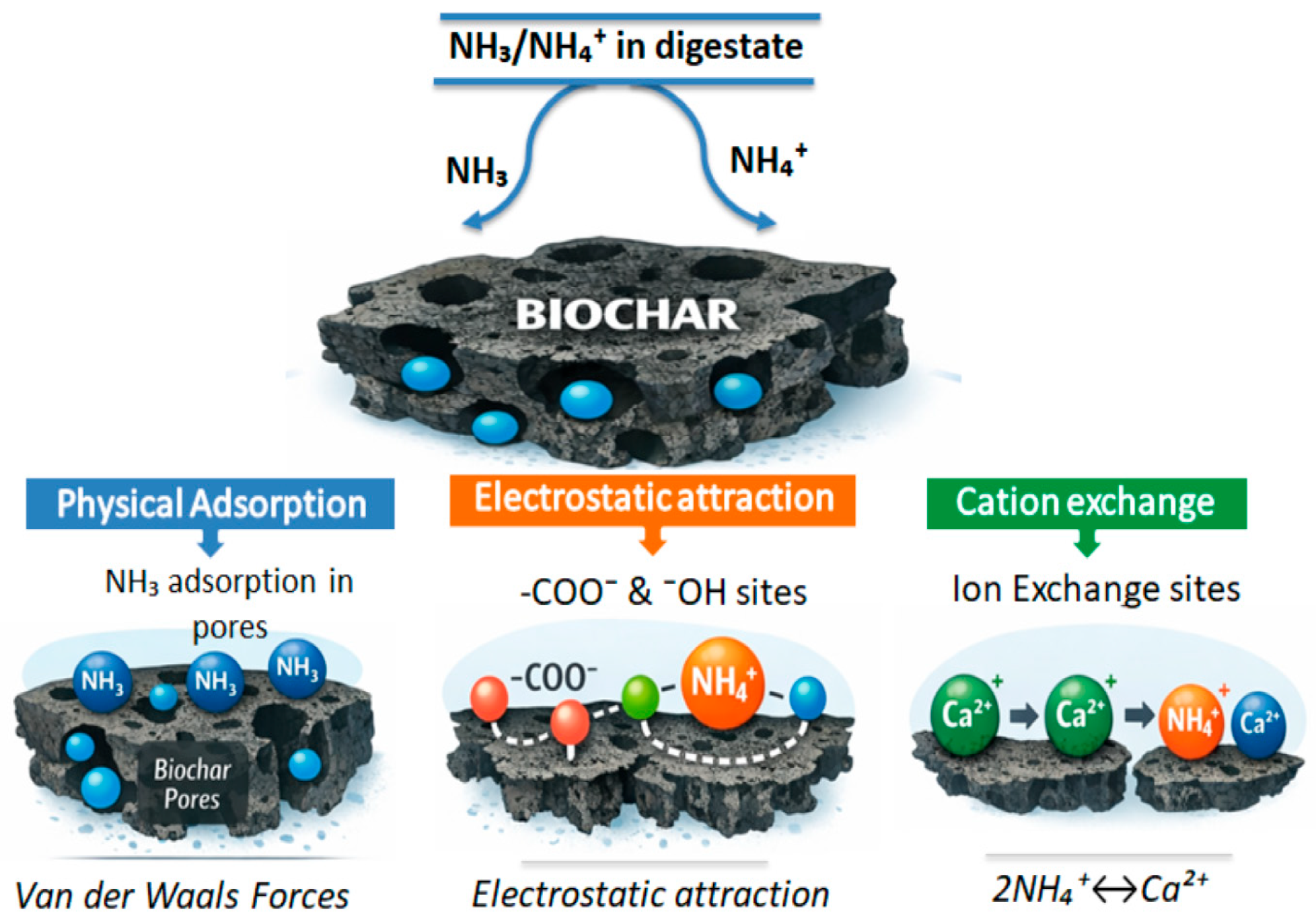 - Cai, Y.; Zhu, M.; Meng, X.; Zhou, J.L.; Zhang, H.; Shen, X. The role of biochar on alleviating ammonia toxicity in anaerobic digestion of nitrogen-rich wastes: A review. Bioresour. Technol. 2022, 351, 126924. [Google Scholar] [CrossRef] [PubMed]