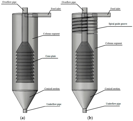 3D schematic diagram of two different cyclone clarifiers. (a) Traditional cyclone clarifier; (b) Spiral guide groove cyclone clarifier.