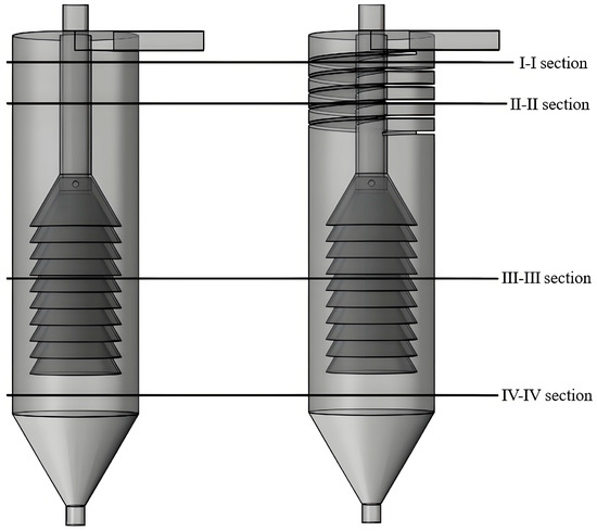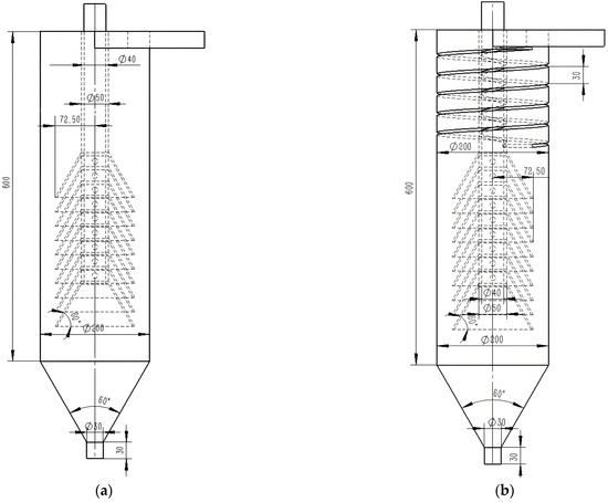 The guide groove mainly guides the flow. Its thickness has little effect on the flow field. The outer diameter of the guide groove is the same as the cylinder’s inner wall diameter. The inner diameter is the same as the overflow pipe’s outer wall diameter. Parameters for each coil are the same as the first coil. Parameters for the two structures are shown in Figure 2. Dimension parameters are shown in Table 1.