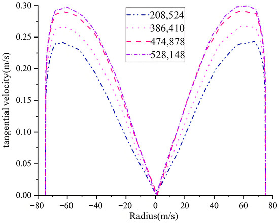 A quantitative analysis based on the Grid Convergence Index (GCI) was conducted to evaluate the influence of mesh density on numerical results. Four systematic meshes were generated. The mesh with 208,524 elements was excluded from the quantitative analysis due to its low cell count, potentially failing to meet asymptotic convergence requirements. Subsequently, the meshes with 386,410, 474,878, and 528,148 elements were used as the coarse, medium, and fine sets for GCI calculation. The Grid Convergence Index analysis demonstrated that the GCI value from the medium to the fine mesh was 2.08%, which met the convergence criteria, while the GCI from the coarse to the medium mesh was 6.46%, indicating insufficient accuracy. Based on these findings, the medium mesh configuration was selected for all subsequent simulations, achieving an optimal balance between computational accuracy and efficiency. The mesh quality was assessed using tangential velocity. The relationship between tangential velocity and mesh density is shown in Figure 3. Fluid tangential velocity relates to the elements’ number within a certain range. Tangential velocity increases with the elements’ number. When the elements’ number reaches 474,878, tangential velocity shows no obvious fluctuation with further increase. This indicates that more elements have no significant impact on numerical simulation but increase computation time. Therefore, this numerical analysis uses 474,878 elements. The elements’ division results are shown in Figure 4.