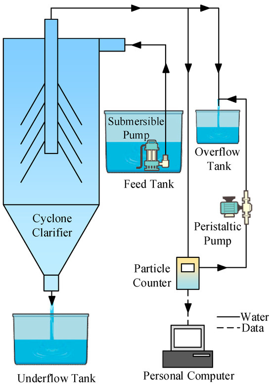 An experimental test rig was constructed to investigate the sedimentation performance of a traditional cyclone clarifier. The schematic diagram of the cyclone clarifier experimental system is outlined in Figure 5. Mine water was fed into the cyclone clarifier by a submersible pump. Efficient particle separation was achieved through a combination of centrifugal sedimentation and cone-plate settling. Following separation, the concentrated particles were discharged from the underflow outlet of the clarifier into an underflow tank. The clarified water exited through the overflow outlet and was directed to an overflow tank. To evaluate separation efficiency, a peristaltic pump was used to draw a continuous sample stream from the overflow. An online particle counter monitored the particle concentration in the overflow in real-time, with the data being logged and analyzed by a computer.