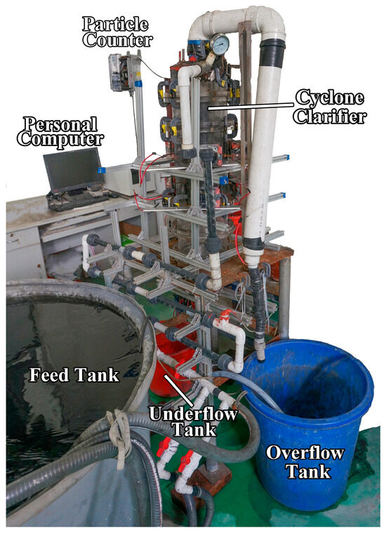 A physical diagram is shown in Figure 6. The test setup is shown in Figure 7. The particle size distribution in the mine water was determined by laser particle size analysis. The measured volume fractions for particles with diameters of 10 μm, 15 μm, 20 μm, 25 μm, and 30 μm were 33.33%, 26.66%, 20%, 12.33%, and 6.66%, respectively. The particle density was 1500 kg/m3. The system operated at a flow rate of 1 m3/h. This flow rate was measured using a flow meter. The meter was calibrated by collecting the total fluid volume over a predetermined time interval. The effluent particle concentration and size distribution were monitored in real-time using an online particle counter (Hach, Model 2200 PCX, Loveland, CO, USA). This instrument can detect and size particles in multiple channels within the range of 2 to 750 μm, providing the data necessary for calculating removal efficiency. The main sources of measurement uncertainty included instrument precision, human reading error, and water temperature fluctuations.