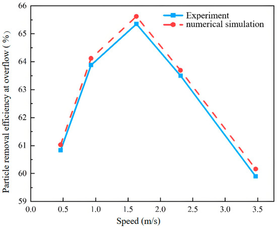 Figure 8 compares the simulated and experimental particle removal efficiencies at the overflow under different inlet velocities (0.46, 0.93, 1.63, 2.31, and 3.47 m/s). The results demonstrate excellent agreement between the two, with marginal deviations of only 0.20, 0.24, 0.27, 0.14, and 0.26 percentage points, respectively. This close alignment confirms that the numerical simulation accurately captures the real physical process, thereby validating its feasibility for this study.