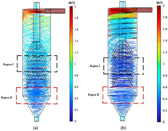 As shown in Figure 10b, after adding the spiral guide groove, streamlines are dense at the inlet. The number of rotations increases. Separation time lengthens. Particles of different sizes can fully separate here. Streamlines in Region I are denser. This indicates that more particles enter the cone-plates for settling. Streamlines below the cone-plates in Region II are sparse. This indicates fewer outer and inner vortices in the cone section. Less flow enters the overflow pipe from the underflow. This is more favorable for particle settling and separation.