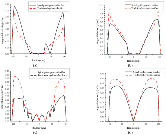Figure 12 shows tangential velocity comparisons in different sections. At all four sections, tangential velocity increases from the outer wall and then decreases to 0 m/s as the radius decreases. The traditional cyclone clarifier has no guide groove constraint. The cylinder diameter is large compared to the inlet. So, velocity decreases significantly when fluid enters the cylinder. The spiral guide groove cyclone clarifier has a small descent height per rotation. The cross-sectional area between grooves is small. So, the velocity decrease is smaller when fluid enters the cylinder. Combined with streamlined analysis, Section I-I has a higher tangential velocity in the spiral guide groove cyclone clarifier. Centrifugal force is larger. This favors particle separation.