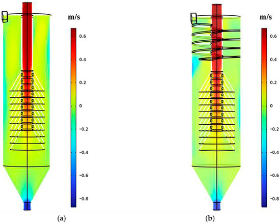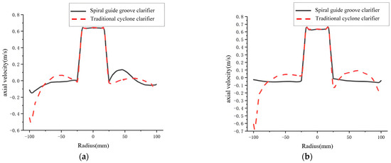 Axial velocity distribution contour plot of fluid. (a) Traditional cyclone clarifier; (b) Spiral guide groove cyclone clarifier.