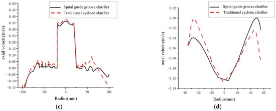 Axial velocity distribution contours for both clarifiers are shown in Figure 13. The overall distributions are similar. Axial velocity is highest at the overflow and underflow outlets. The spiral guide groove restricts axial motion. So, axial velocity is small here. The separation time is long. Combined with previous analysis, the tangential velocity is high here. Centrifugal force is large. This favors full particle separation. Losing the guide effect at the groove end causes a local increase in axial velocity. Except for near the groove end, as axial velocity near the outer wall is higher in the traditional cyclone clarifier. The separation time is short.