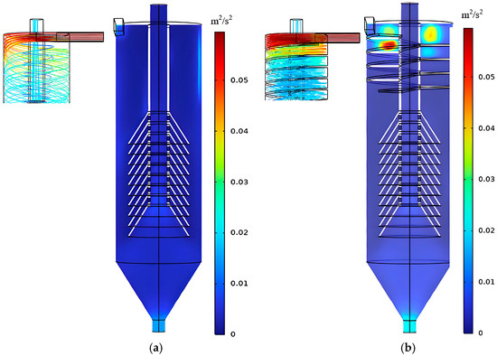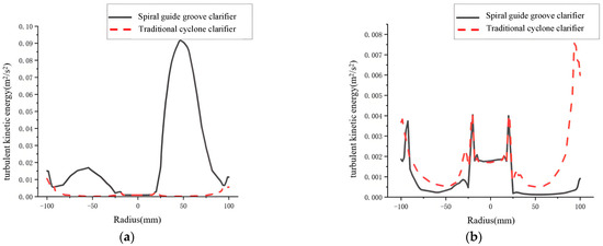 Turbulent kinetic energy distribution contour plot. (a) Traditional cyclone clarifier; (b) Spiral guide groove cyclone clarifier.