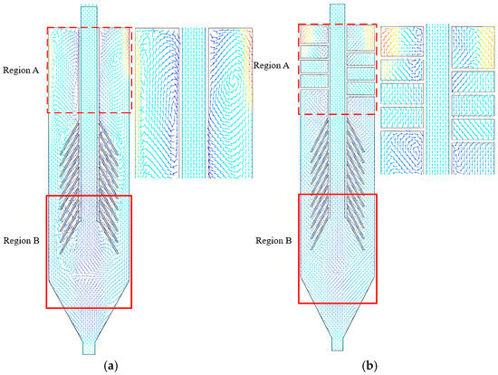 Velocity vector variation diagram. (a) Traditional cyclone clarifier; (b) Spiral guide groove cyclone clarifier.