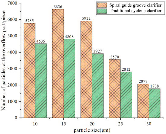 The overflow contains particles of various sizes. To more intuitively study the effect on different particle sizes, particle numbers for 10, 15, 20, 25, and 30 μm particles at the overflow were compared. The result is shown in Figure 19. For particles larger than 25 μm, settling performance is good due to the larger mass and centrifugal force. Particle numbers at the overflow are approximately equal for both devices. This indicates the spiral guide groove has little effect on large particle settling. For 15–20 μm particles, the spiral guide groove cyclone clarifier has better settling performance compared to the traditional cyclone clarifier. This indicates the spiral guide groove mainly improves removal efficiency for particles in the 15–20 μm range. It more effectively suppresses particle overflow from the outlet. It improves separation efficiency. For 10 μm particles, the settling performance of the spiral guide groove cyclone clarifier begins to decrease. This indicates the spiral guide groove structure has less impact on the removal efficiency of very fine particles below 10 μm.