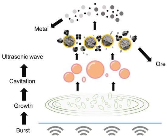 The application of efficient and cost-controllable platinum recovery methods can not only reduce the demand for raw ore resources but also effectively alleviate the environmental pollution caused by discarded catalysts to the ecological environment. In the traditional field of platinum extraction technology, the wet leaching process, with its advantages such as mild reaction conditions and controllable selectivity, has become the main technical process for platinum extraction under conventional circumstances [8]. The core mechanism of this type of process is the coordination dissolution effect in the acid medium. By using sulfuric acid, hydrochloric acid and corresponding chlorides, oxides, etc., as leaching agents, the dissolution of platinum is achieved through the coordination interaction between ligands and Pt ions, providing a prerequisite for subsequent separation, purification and recovery [9]. On this basis, introducing ultrasonic waves as the leaching enhancement technology can further optimize the leaching efficiency [10]. Its core function stems from the synergistic effect of cavitation, mechanical and thermal effects triggered by ultrasonic waves: When ultrasonic waves propagate in a liquid, they generate periodic pressure changes. During the negative pressure phase, tiny bubbles expand rapidly, while during the positive pressure phase, the bubbles collapse instantly. This is the cavitation effect. At the moment of collapse, local high temperatures ranging from 500 to 15,000 K and high pressures from 100 to 5000 mpa can be produced, accompanied by intense shock waves and micro-jets. It can not only destroy the passivation film on the surface of platinum particles, promote the micro-fragmentation of the alumina carrier to expose the hidden platinum sites, but also vigorously stir and wash the surrounding medium, enhancing the material transfer of [11]. Meanwhile, the high-frequency vibration of liquid molecules triggered by ultrasonic waves forms a mechanical effect, achieving liquid stirring and particle dispersion, and further enhancing the contact efficiency between the leaching agent and platinum. The thermal effect where the vibration energy is absorbed by the medium and converted into thermal energy can increase the system temperature, optimize the physical properties of the liquid, simultaneously enhance the efficiency of mass transfer and heat transfer, and create favorable conditions for the leaching reaction [12]. Ultrasonic vibration can significantly reduce the thickness of the diffusion layer at the solid–liquid interface, lower the mass transfer resistance between the leaching agent and platinum ions, accelerate particle breakage and induce the generation of oxidative free radicals [13]. The ultrasonic enhancement mechanism and the coordination dissolution effect of the acid medium form a synergy, which not only shortens the time for leaching to reach equilibrium, but also breaks through the mass transfer limitations of traditional wet leaching, achieving a significant improvement in leaching efficiency and providing technical support for the platinum extraction process [14]. The principle is shown in Figure 1.