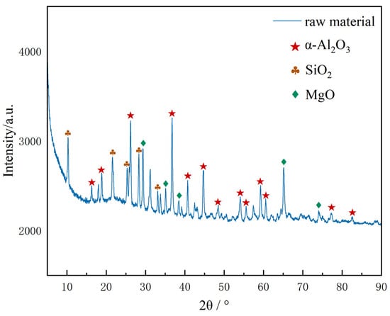 Figure 3 shows the X-ray diffraction (XRD) pattern of the platinum-containing spent catalyst raw materials used in the experiment. The pattern analysis indicates that the main components of the sample are Al2O3 and SiO2. Due to the low content of element Pt in the raw materials, its characteristic diffraction peak signal is masked by the diffraction peak of the strong carrier phase, and no obvious response is observed. Among the catalyst raw materials used, α-Al2O3 is the main phase. As a classic carrier widely applied in the field of precious metal catalysts, α-Al2O3 features excellent thermodynamic stability, mechanical strength and chemical inertness. Its crystal structure characteristics can provide a stable carrier for the Pt active component, ensuring the structural integrity during the catalytic reaction process [20]. To reduce the mass transfer resistance during the leaching process, the spent catalyst was ground to 80 mesh fine powder before the experiment to ensure full contact between platinum and the leaching agent.
