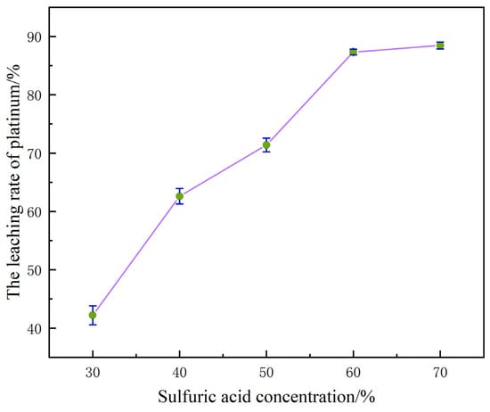 When the concentration of H2SO4 increased from 30% to 70%, the leaching rate of platinum showed a significant upward trend, rapidly climbing from the initial 42.53% to 88.78%. The essence of this phenomenon is that the continuous increase in H+ concentration in the system not only accelerates the oxidation process of platinum but also promotes the transformation of metallic platinum into Pt2+. In a system where acidic media coexist with chlorides, Pt2+ can further form stable soluble compounds, thereby effectively inhibiting the precipitation of platinum in the form of precipitates or its retention in the solid phase. It can be seen from this that increasing the dosage of H2SO4 within the above-mentioned concentration range can promote the more efficient transition of platinum from the solid phase to the liquid phase system, thereby significantly optimizing the leaching efficiency of platinum [22].