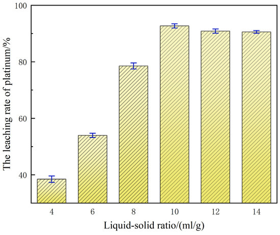 When the liquid-to-solid ratio is 4:1, the leaching rate of platinum is merely 38.80%. This relatively low leaching efficiency is primarily ascribed to the insufficient effective concentrations of H+ and Cl− in the system under this liquid-to-solid ratio, which constrains the sufficient oxidation and dissolution reactions of platinum, ultimately leading to the leaching performance failing to meet the expected standards [25]. As the ratio gradually increased to 10:1, the reaction environment improved the sufficient liquid volume and maintained the acidic environment and stable formation of chloro-complexes, raising platinum leaching rate to 92.97%. Compared with the leaching efficiency at a liquid-to-solid ratio of 4:1, this represents a significant increase of 54%. Nevertheless, further elevation of the liquid-to-solid ratio beyond 10:1 (e.g., 12:1) engenders a progressive dilution of H+ and Cl− activities, thereby diminishing the driving force for both oxidative and complexation reactions. Concomitantly, the augmented volumetric excess escalates reagent usage and post-treatment expenditure, manifesting a pronounced downward trajectory in platinum leaching efficiency.