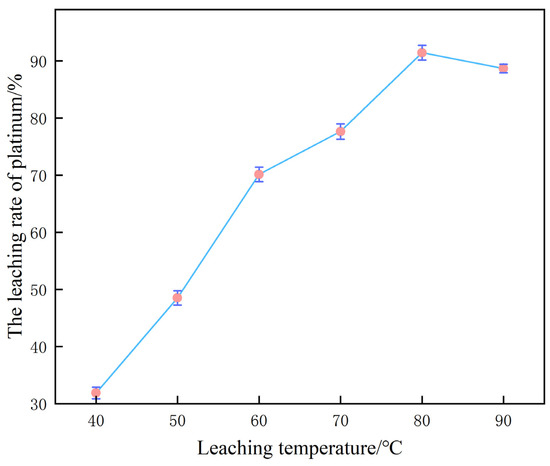 Under the baseline parameter matrix of 60% H2SO4, 0.10 mol/L NaCl and a liquid-to-solid ratio of 10 mL/g, reaction temperature is identified as the pivotal intensive variable governing platinum leaching efficiency; the corresponding experimental dataset is presented in Figure 7.