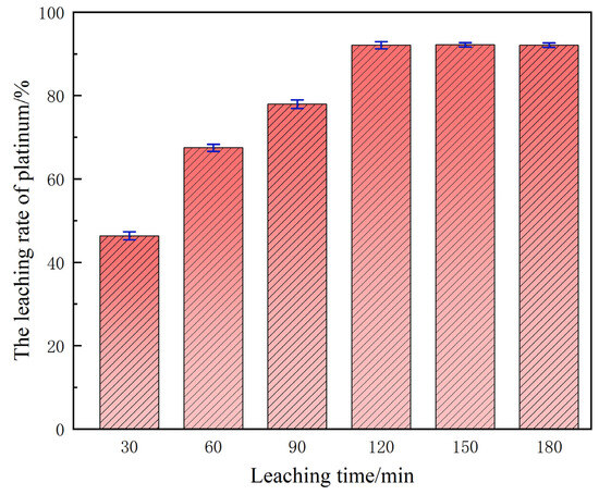 Systematic single-factor investigations have established 120 min as the optimal leaching duration for the conventional system. Under this condition, both the oxidative dissolution of platinum and its subsequent chloro-complexation proceed to completion, affording a compromise between maximal extraction efficiency and process economy, thereby furnishing a baseline parameter set for the subsequent ultrasound-intensified optimization.