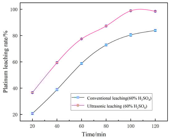 For the remaining single-factor variable “leaching time”, a parallel comparative experiment was further carried out between the ultrasound-assisted group and the conventional group without ultrasound. The results showed that the ultrasound-assisted group achieved the optimal Pt leaching rate of 99.12% at 100 min. However, when the residence time was extended to 120 min, determined by single-factor optimization, the Pt leaching rate of the ultrasound-assisted group decreased instead. The conventional non-ultrasound group showed a continuous and slow increase in the leaching rate over time. The specific data are shown in Figure 10.