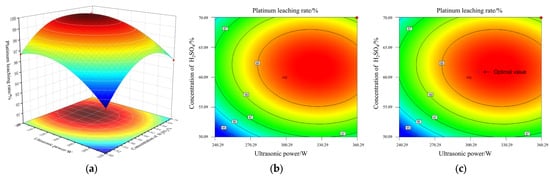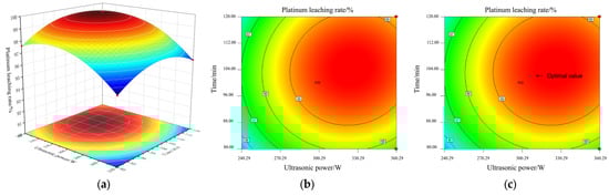 As shown in (a), the response surface is in a typical convex arch shape. This indicates that there is a significant nonlinear relationship between ultrasonic power and leaching time on the leaching rate. Below their respective optimal values, increasing the ultrasonic power or extending the leaching time can effectively promote the leaching of platinum. However, when any factor exceeds its optimal threshold, further increasing the level of that factor will instead lead to a decrease in the leaching rate.