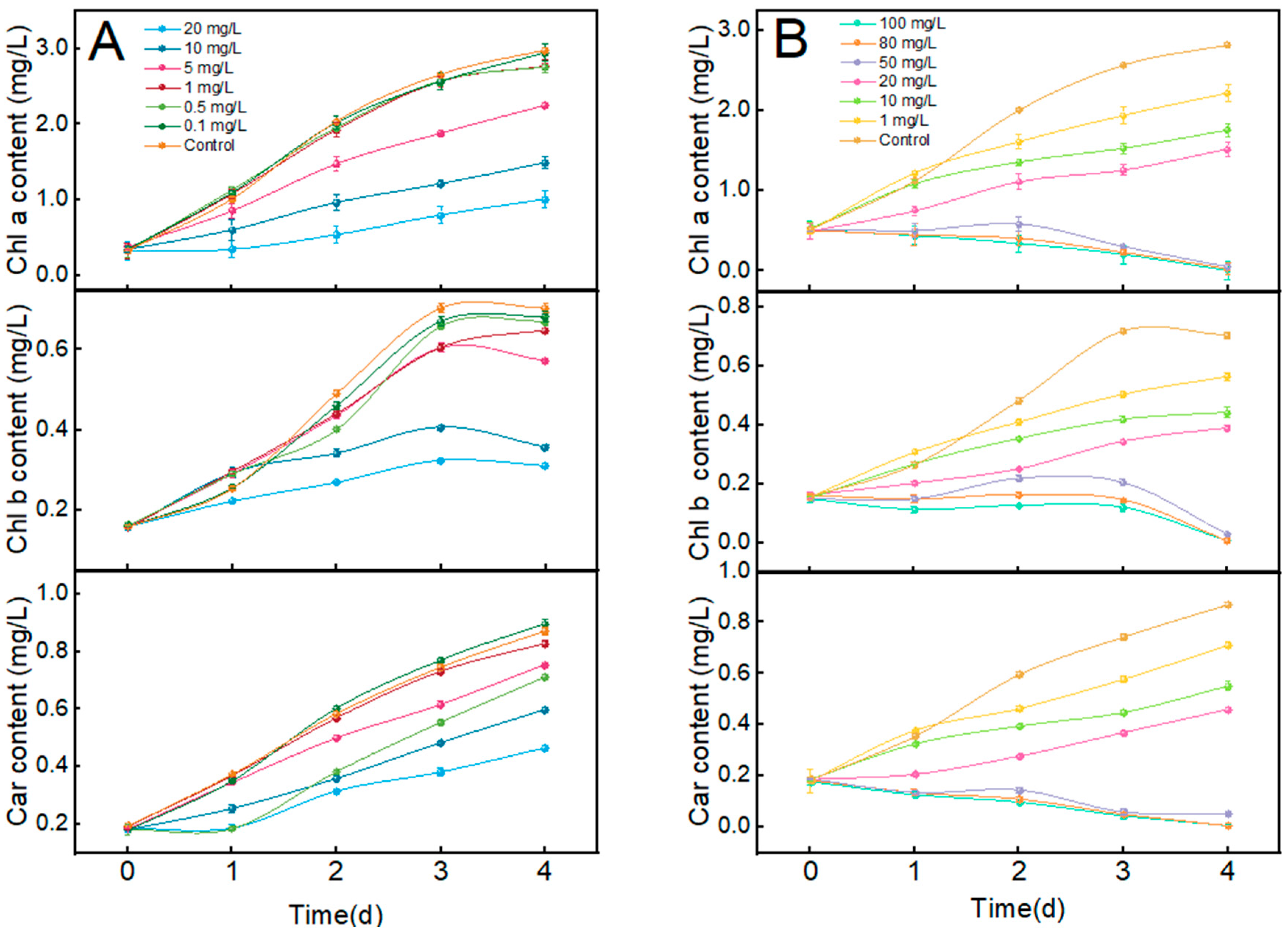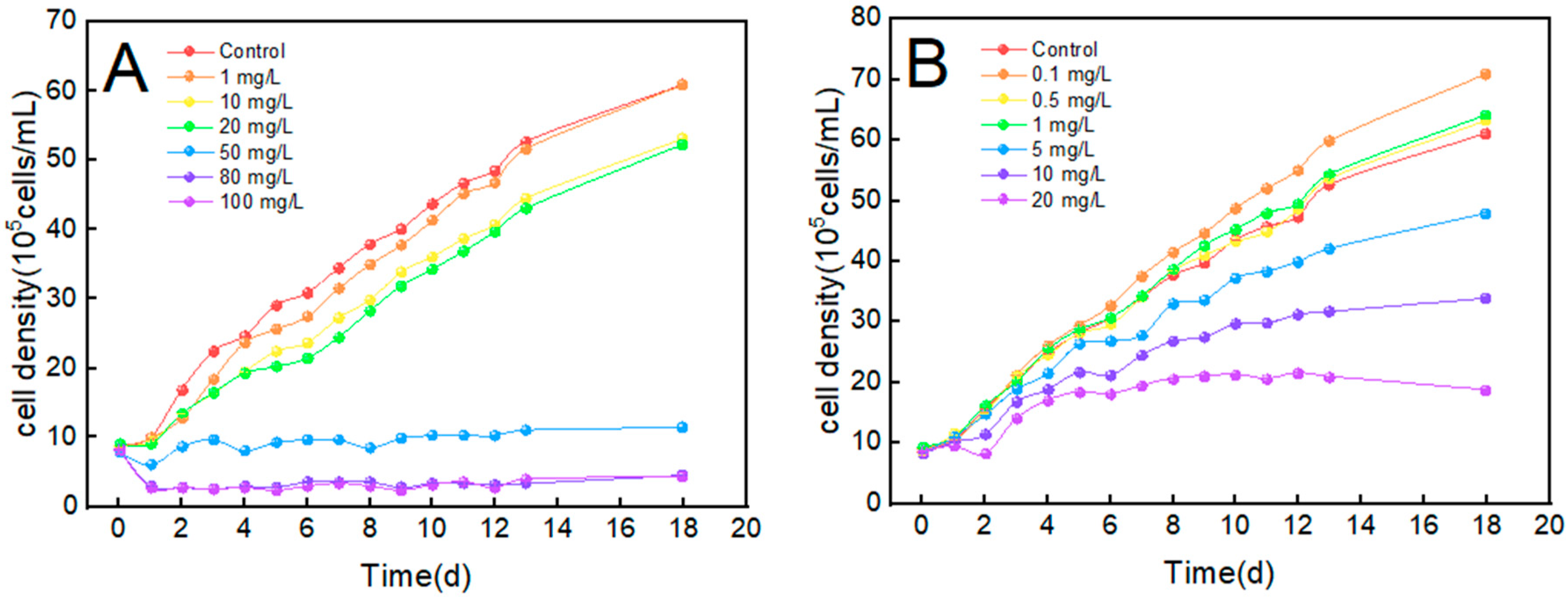3.1. The Growth Effects of Varying Concentrations of Cr(III) and Cr(VI) on Algal Cells