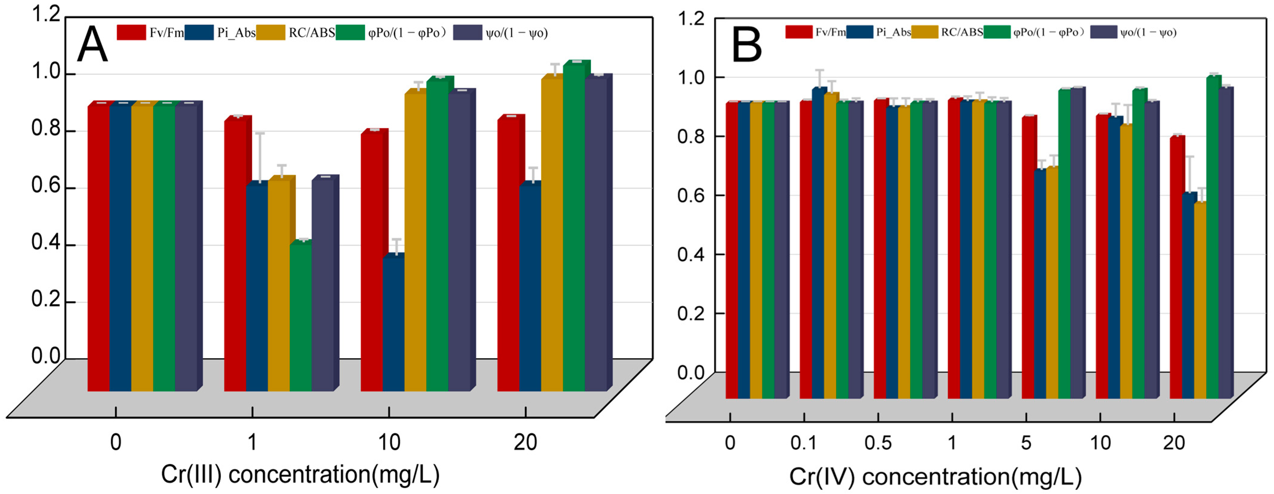 4.2. Cr(III) and Cr(VI) Induced Damage to Photosynthesis in D. salina