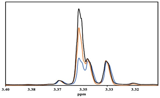 1H NMR spectra of Evan Williams Bottled-in-Bond sample titrated with methanol: no added methanol (blue line), 1.8 mM added methanol (orange line), and 3.5 mM added methanol (black line).