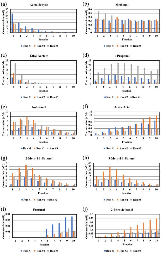 Bar graphs of congener concentrations taken by NMR in different fractions from a 5-gallon Vevor still. Fractions from the three runs are presented independently to show run-to-run variability in absolute value, but similarity in congener concentration trends across the 10-fraction distillation run. Congeners: (a) acetaldehyde, (b) methanol, (c) ethyl acetate, (d) 1-propanol, (e) isobutanol, (f) acetic acid, (g) 2-methyl-1-butanol, (h) 3-methyl-1-butanol, (i) furfural, (j) 2-phenylethanol.