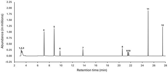 Representative SIM chromatogram of the studied analytes. The chromatogram was acquired in SIM mode using the GC-MS method described in Section 2. Peak identification: 1 = ethyl acetate; 2 = 1,1-diethoxyethane; 3 = methanol; 4 = 1-propanol; 5 = isobutanol; 6 = isoamyl acetate; 7 = ethyl hexanoate; 8 = ethyl octanoate; 9 = furfural; 10 = acetic acid; 11 = methyl decanoate (internal standard); 12 = 2-phenylethanol.