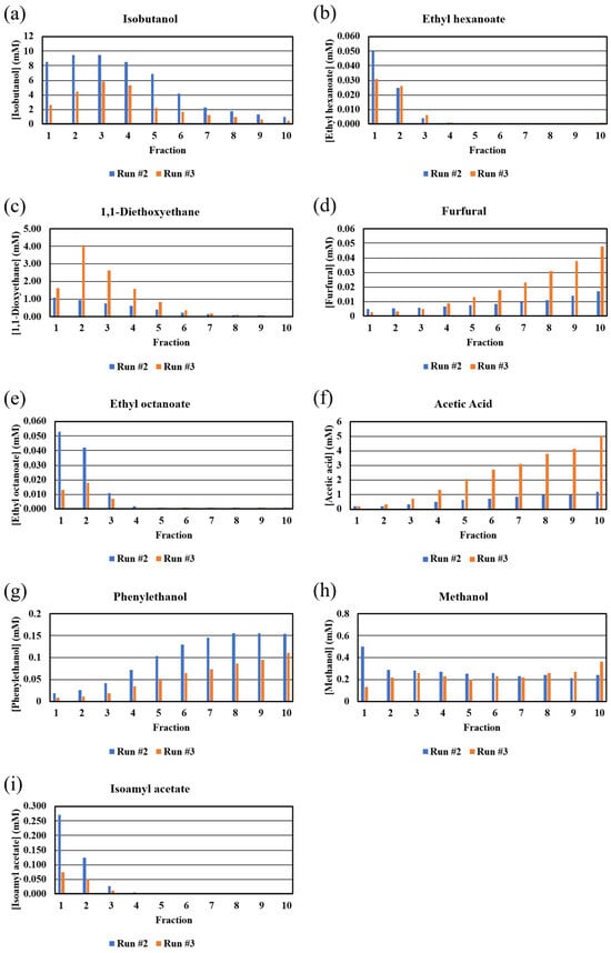 GC-MS-derived congener concentrations (mM) in fractions from Run #2 and Run #3. Congeners: (a) isobutanol, (b) ethyl hexanoate, (c) 1,1-diethoxyethane, (d) furfural, (e) ethyl octanoate, (f) acetic acid, (g) phenylethanol, (h) methanol, (i) isoamyl acetate.