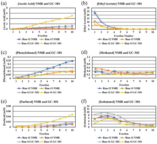 Comparison of NMR- and GC-MS-determined congener concentrations (mM) in each fraction from Run #2 and Run #3. Congeners: (a) acetic acid, (b) ethyl acetate, (c) phenylethanol, (d) methanol, (e) furfural, (f) isobutanol.
