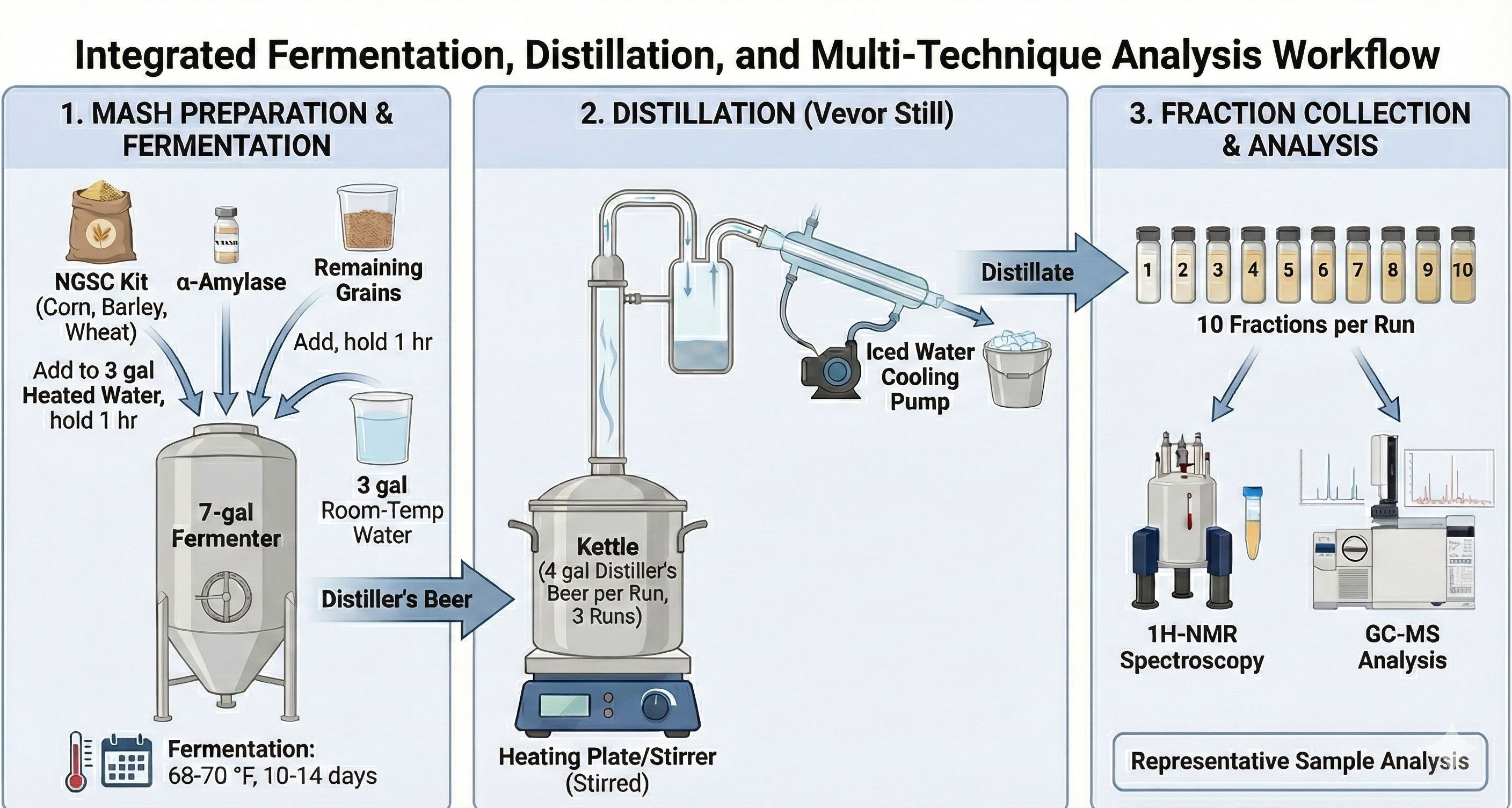 Preparation of the distiller’s beer. The 5-gallon NGSC cracked corn, malted barley, and wheat kit from the North Georgia Still Company (Dahlonega, GA, USA) was used to prepare the distiller’s beer, according to the instructions included in the kit. Initially, 3 gallons of heated water are added to a 7-gallon fermenter. The cracked corn and α-amylase are added, and after an hour, the other milled grains are added. After another hour, 3 gallons of room temperature water are added to the mash. The total volume of the fermenter at this point was nearly 7 gallons making it very difficult to stir the mash and aerate later in the procedure. The original densities of the mashes, determined using an Anpro refractometer (Fuzhou, China; sourced from Amazon.com) and sucrose as the standard, for the three runs were 1.071, 1.062, and 1.072.