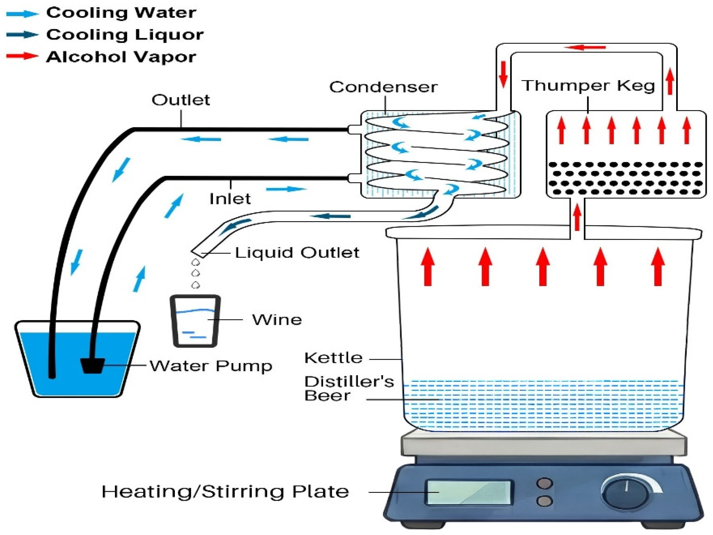 Figure S1) was purchased from Amazon and used according to instructions, with one exception. A 9.5-inch piece of copper tubing (3/8” ID) was cut and welded to the input port of the thumper top so that the tubing extended into the liquid in the thumper. The thumper was charged with 150 mL of heads/tails collected from a previous distillation run. During distillation, a submergible pump, used to cool the condenser, was placed in a cooler filled with iced water. The kettle was heated using a Fisher Brand heating plate/stirrer (max heating setting of 540 °C), and the distiller’s beer was stirred during distillation to reduce the chances of scalding and to more uniformly heat the distiller’s beer during distillation (