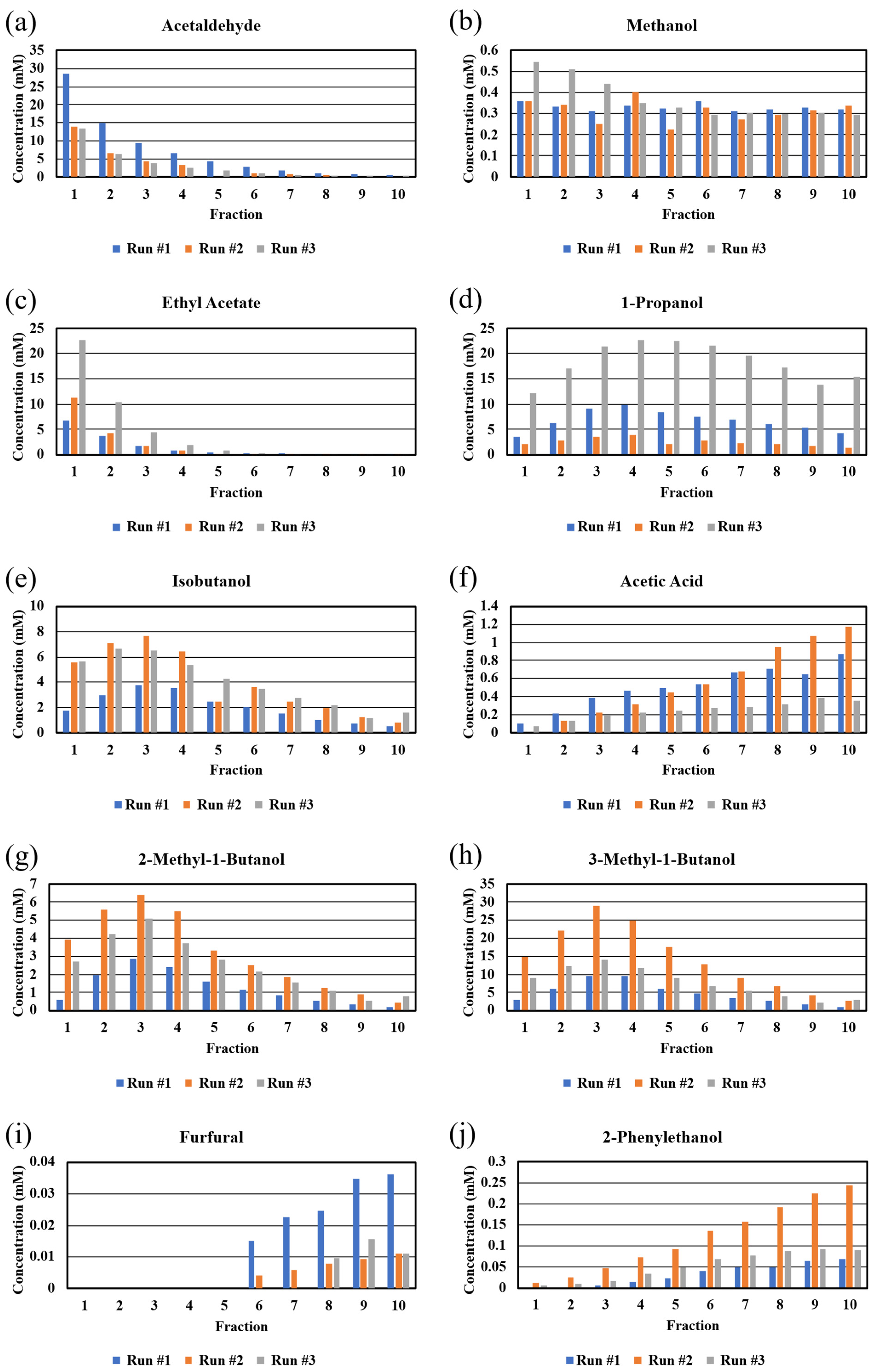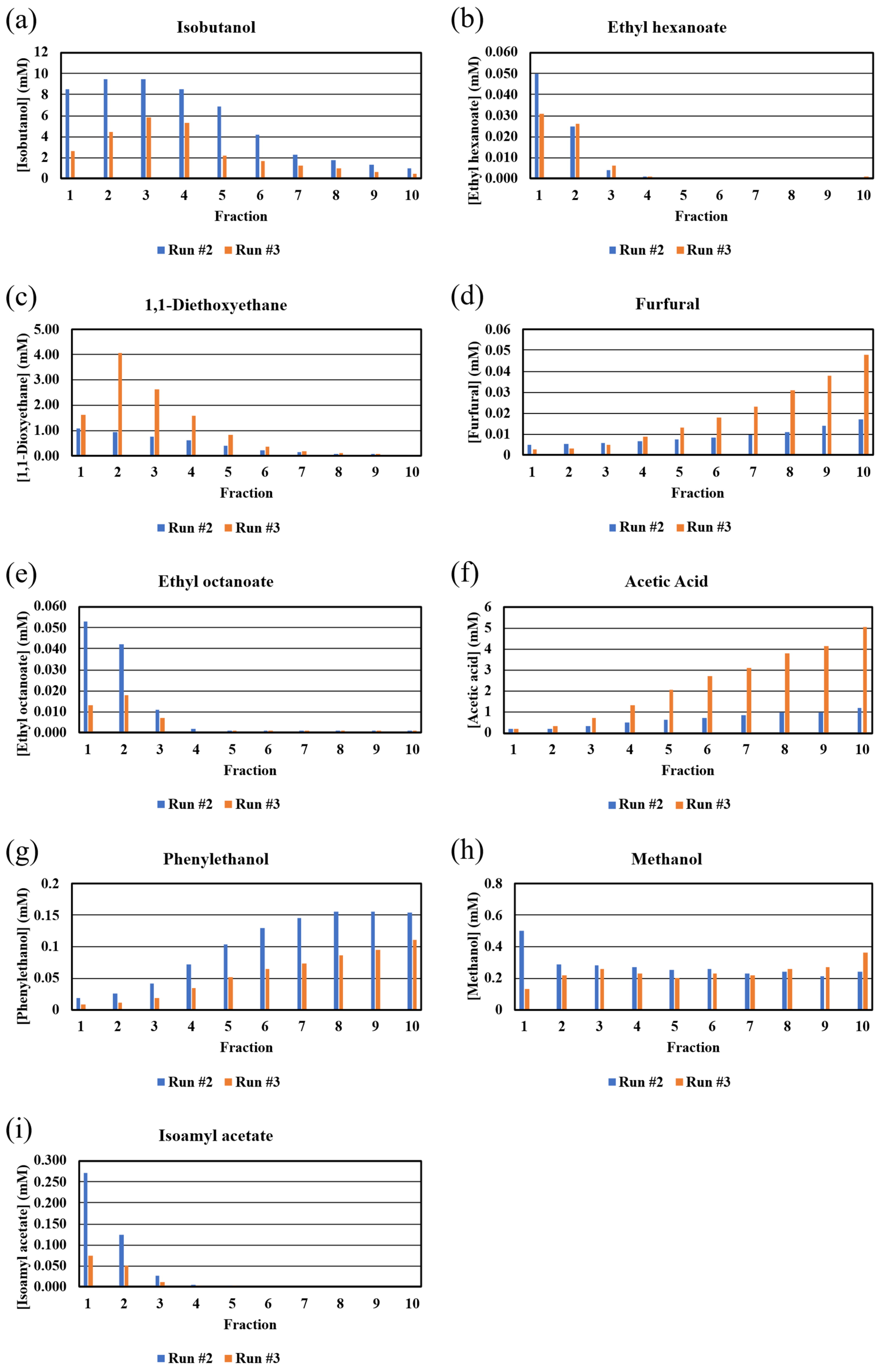25], this technique was also used to analyze the fractions from the Vevor still. We were unable to analyze fractions from the first distillation run, since we ran out of many of the samples before GC-MS analyses. Therefore, we analyzed the fractions from Runs #2 and #3 for the concentrations of methanol (148.5 °F/64.7 °C), ethyl acetate (170.8 °F/77.1 °C), 1,1-diethoxyethane (215.6 °F/102 °C), isoamyl acetate (287.6 °F/142 °C), ethyl hexanoate (334.4 °F/168 °C), ethyl octanoate (406.4 °F/208 °C), isobutanol (226.4 °F/108 °C), furfural (323.1 °F/161.7 °C), acetic acid (244.2 °F/117.9 °C), and phenylethanol (399.2 °F/204 °C).
