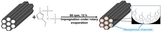 Silver-functionalized ionic liquid-loaded MCM-41 composites were prepared using an impregnation–evaporation method, as schematically illustrated in Figure 1. [Emim][BF4] was first dried under vacuum at 333.15 K for 12 h. The dried ionic liquid was then mixed with AgBF4 at a molar ratio of 4:1 and stirred at 298.15 K for 12 h to obtain the Ag+-containing ionic liquid [22,25]. The resulting ionic liquid was dissolved in 200 mL of anhydrous acetonitrile and magnetically stirred until a homogeneous solution was formed.