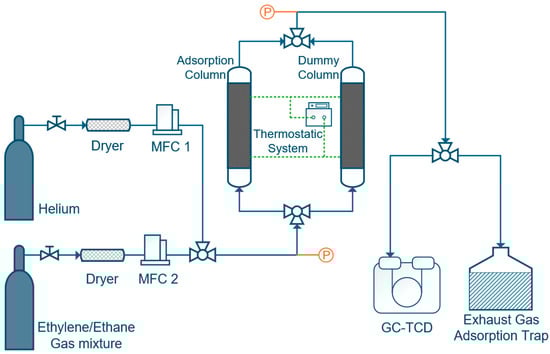Schematic diagram of the fixed-bed apparatus used for C2H4/C2H6 adsorption and separation. MFC denotes the mass flow controller. Dashed lines indicate the thermostatic system, and colors are used solely for schematic illustration.