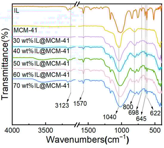 Figure 5 shows the FTIR spectra of pristine MCM-41 and IL@MCM-41 composites. The IL@MCM-41 samples exhibit several characteristic absorption bands that are absent in pristine MCM-41, including B–F stretching vibrations at 698, 645, and 622 cm−1, as well as imidazolium ring C–H and C=N vibrations at 3123 and 1570 cm−1. Meanwhile, the Si–O–Si asymmetric and symmetric stretching vibrations at approximately 1040 and 800 cm−1 remain essentially unchanged, indicating that IL incorporation does not disrupt the silica framework [42]. No new peaks or significant peak shifts are observed, suggesting the absence of new chemical bonds between the ionic liquid and MCM-41; thus, the ionic liquid is primarily immobilized through physical loading rather than chemical interaction.