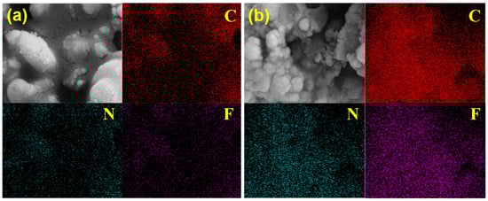 SEM images and EDS elemental mapping (Figure 6) reveal a homogeneous distribution of C, N, and F throughout the IL@MCM-41 composite. Compared with pristine MCM-41, the intensities of these elements are significantly enhanced after IL incorporation. The weak C, N, and F signals observed in pristine MCM-41 are mainly attributed to background contamination and instrumental noise inherent to EDS analysis of light elements. The uniform elemental distribution suggests that the ionic liquid is well dispersed within the mesoporous framework without obvious aggregation, which is beneficial for maintaining open diffusion pathways and enabling rapid access of C2H4 molecules to the active sites.
