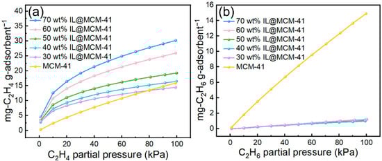 Adsorption performance of C2H4 and C2H6 on pristine MCM-41 and IL@MCM-41 composites is shown in Figure 8. The C2H4 uptake increases substantially with increasing IL loading. At 100 kPa, the C2H4 adsorption capacity rises from 14.45 mg/g at 30.16 wt% IL loading to 30 mg/g at 70 wt%. In sharp contrast, C2H6 adsorption remains extremely low (1–2 mg/g), showing minimal dependence on IL loading and even falling below that of pristine MCM-41. This pronounced uptake disparity confirms a strong preferential adsorption of C2H4 relative to C2H6 in the IL-modified composites.