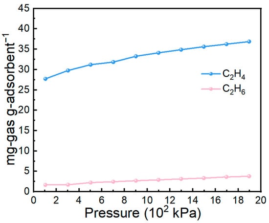Pressure is another important parameter governing gas adsorption behavior. As shown in Figure 10, the 70 wt% IL@MCM-41 composite was examined for C2H4 and C2H6 adsorption over a pressure range of 1–19 bar. The C2H4 uptake increases progressively with rising pressure, from 27.72 mg/g at 100 kPa to 36.87 mg/g at 1.9 × 103 kPa, without reaching a clear saturation limit. This monotonic increase indicates that additional adsorption sites remain available under elevated pressures. In contrast, C2H6 uptake remains consistently low across the entire pressure range, reflecting its weak interaction with the composite. Consequently, the disparity between C2H4 and C2H6 uptakes widens with increasing pressure, clearly showing that higher pressures further reinforce the preferential adsorption of C2H4.