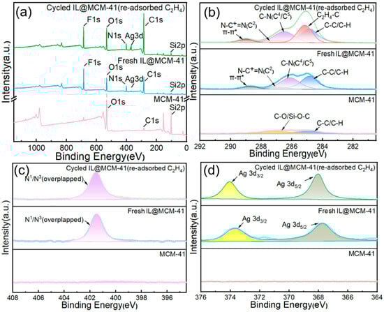 XPS spectra of pristine MCM-41, fresh 70 wt% IL@MCM-41, and cycled 70 wt% IL@MCM-41 after re-adsorption of C2H4 following multiple adsorption–desorption cycles: (a) survey spectra; (b) high-resolution C 1s spectra; (c) high-resolution N 1s spectra; and (d) high-resolution Ag 3d spectra.